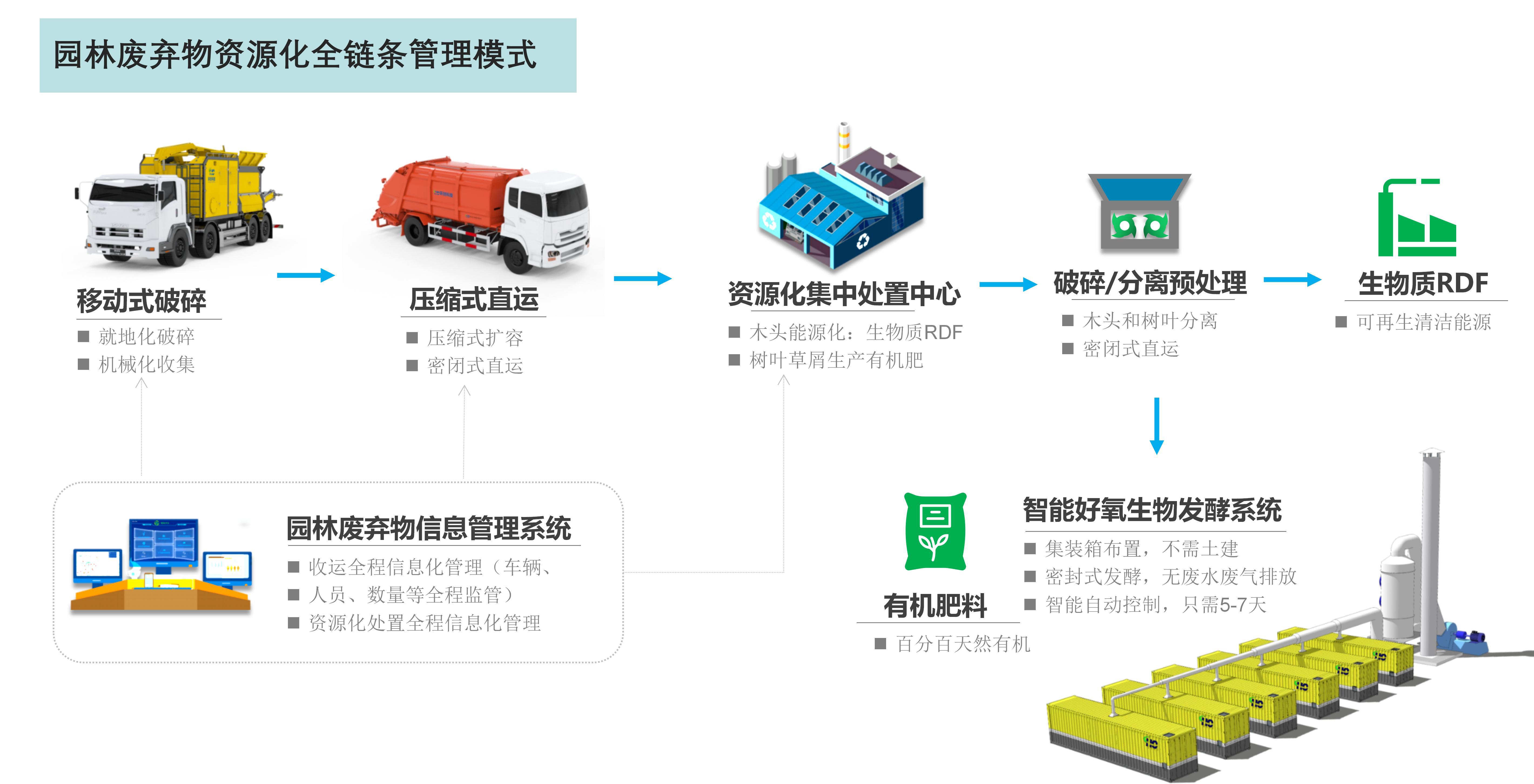 Implement full chain management and centralized resource disposal of garden waste, produce biomass fuel rods and organic fertilizers, and achieve the resource utilization and harmless treatment of garden waste